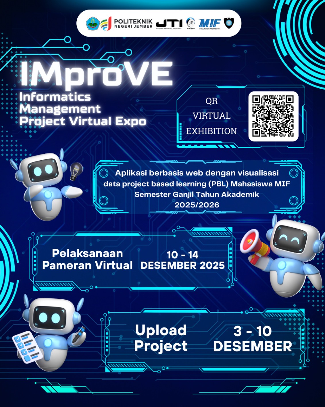 IMProVE (Informatics Management Project Virtual Expo) adalah pameran proyek virtual yang menampilkan hasil akhir dari mata kuliah di program studi Manajemen Informatika yang diadakan pada tanggal 10 sampai 14 Desember 2025.