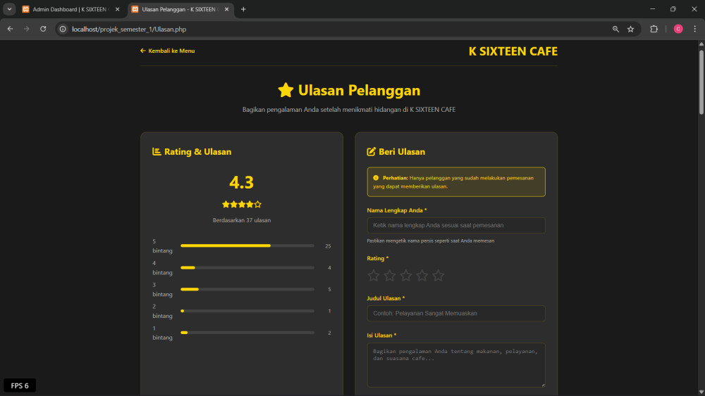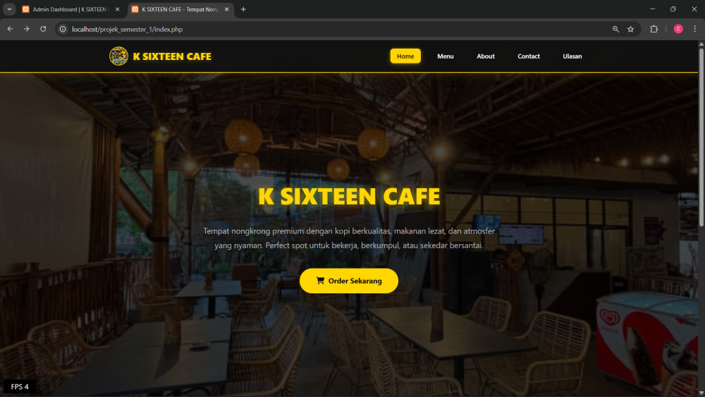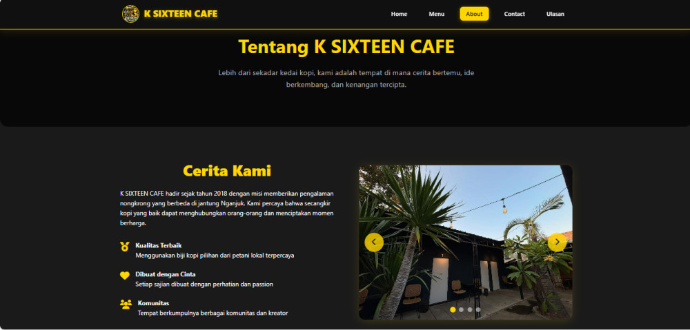 Ini adalah landing page lengkap untuk K-SIXTEEN CAFE. Sebuah kafe lokal yang menghadirkan lebih dari sekadar kopi, tetapi juga ruang komunitas yang hangat. Halaman ini dirancang untuk menampilkan menu andalan, menyediakan informasi kontak, dan menampilkan ulasan asli dari pelanggan.