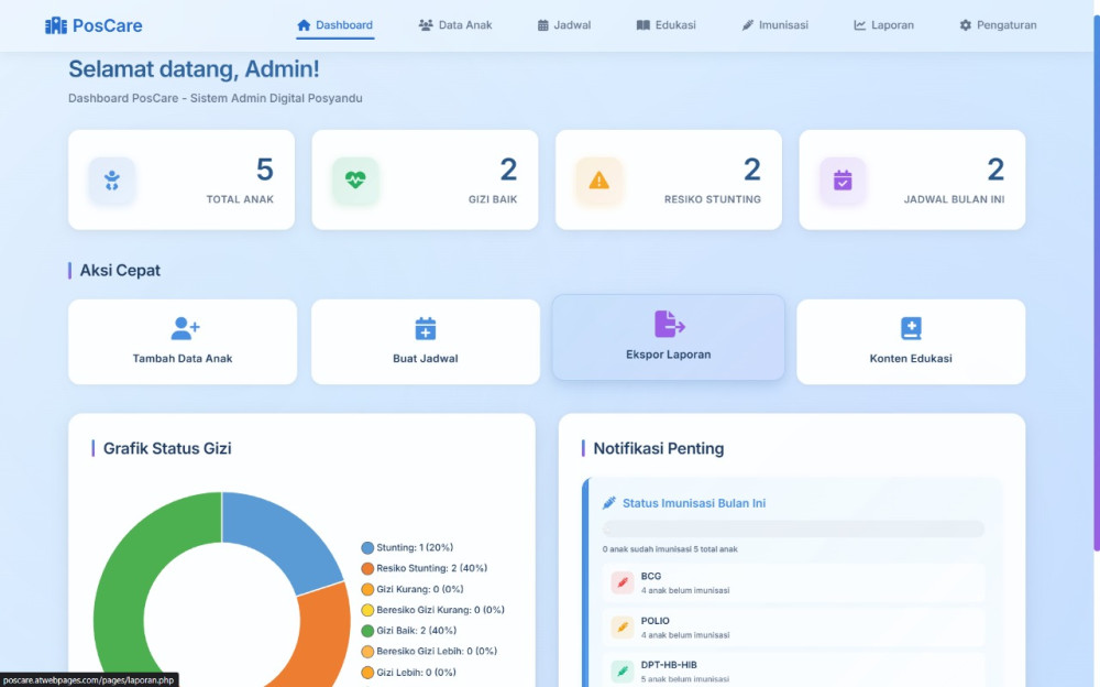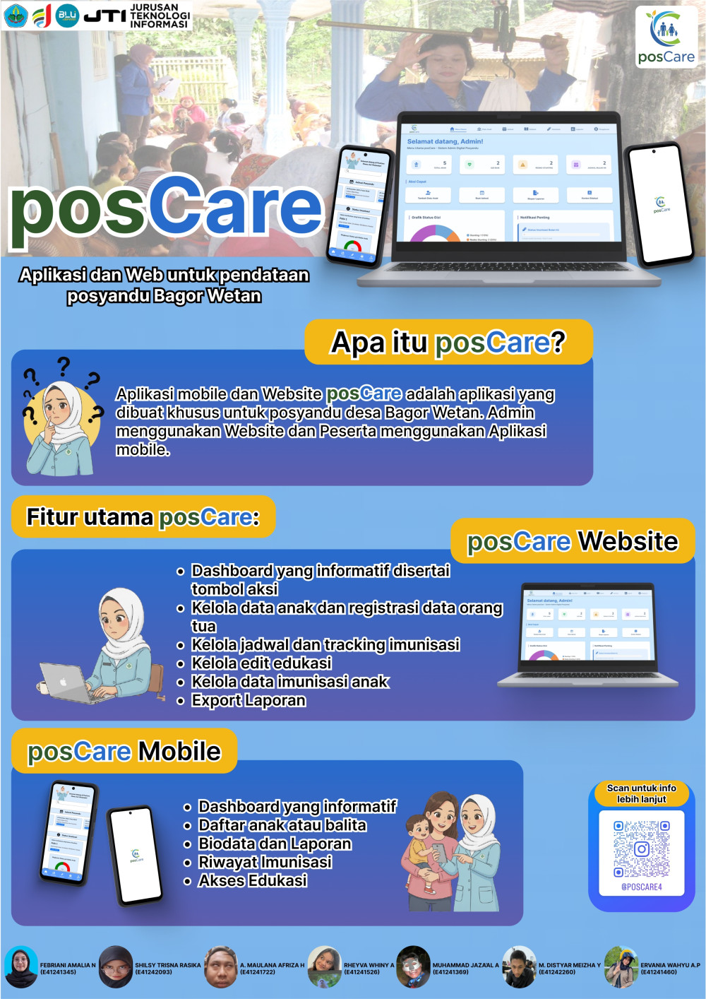 Aplikasi mobile dan Website posCare adalah aplikasi yang dibuat khusus untuk posyandu desa Bagor Wetan. Admin menggunakan Website dan Peserta menggunakan Aplikasi mobile.