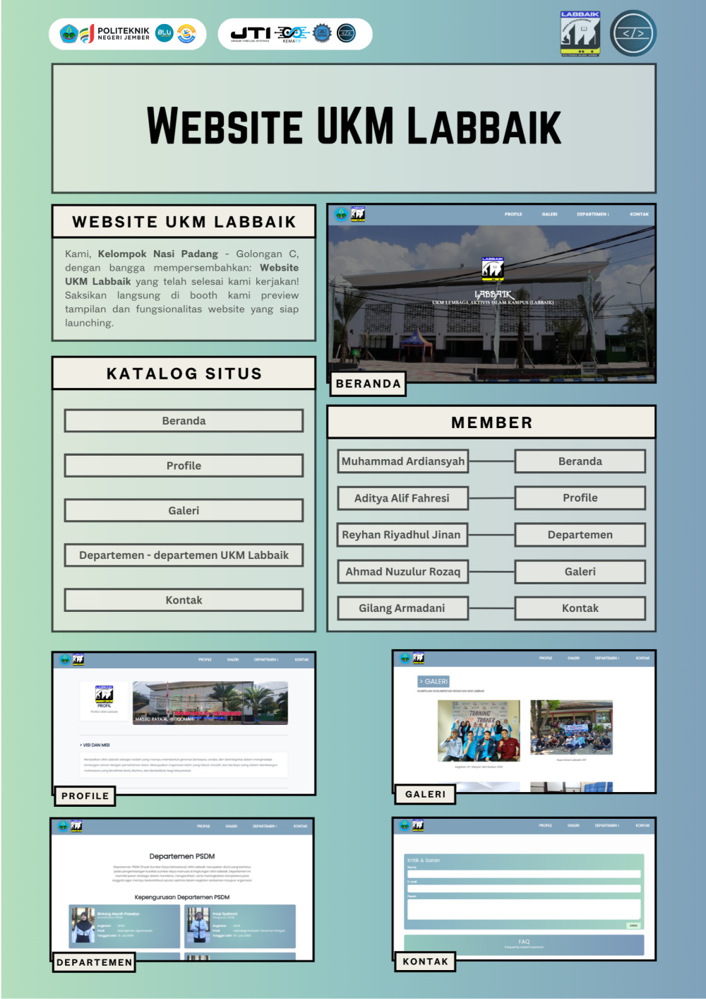 Kami dari kelompok 1 Nasi Padang - Teknik Informatika - C sedang membuat aplikasi berbasis website company profile yaitu UKM Labbaik. Harapan kami mengembangkan website ini supaya bisa bermanfaat kepada masyarakat umum. Website ini masih belum memiliki fitur baru dan hanya kerangka dasarnya saja. Untuk saat ini website nya masih berfokus untuk tampilan desktop, insyaallah kedepannya akan kami kembangkan lagi supaya lebih responsif di tampilan mobile sekaligus menambahkan fitur-fitur baru.