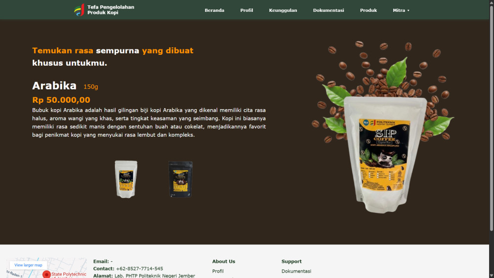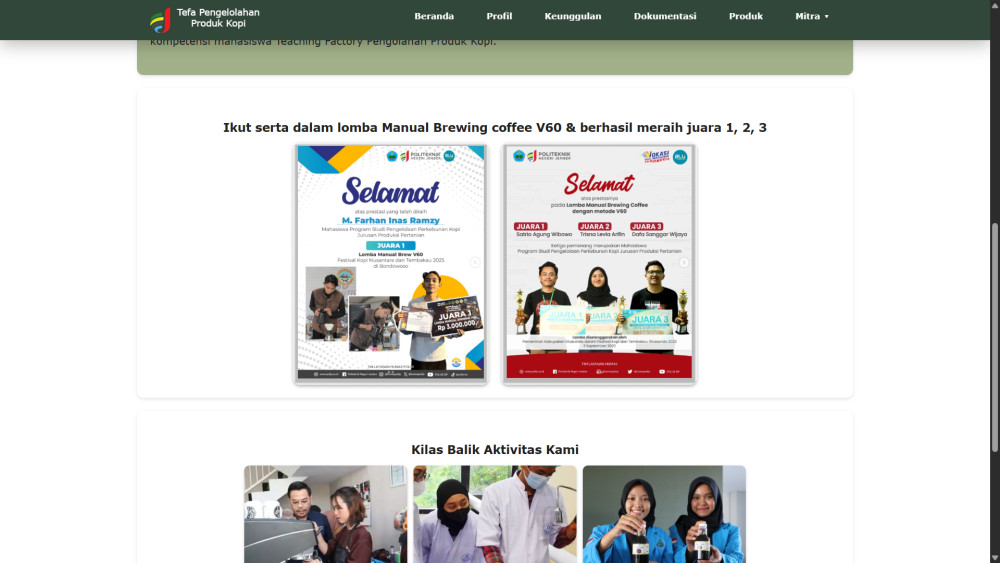 adalah platform digital yang kami bangun untuk menghadirkan informasi lengkap, transparan, dan mudah diakses mengenai kegiatan, produk, serta layanan Teaching Factory (TEFA) Pengolahan Produk Kopi Politeknik Negeri Jember. Melalui website ini, pengguna dapat menjelajahi sejarah TEFA, katalog produk kopi yang terus dikembangkan, dokumentasi kegiatan secara real-time, lokasi TEFA melalui Google Maps, hingga akses form kontak yang langsung terhubung dengan admin atau staf.