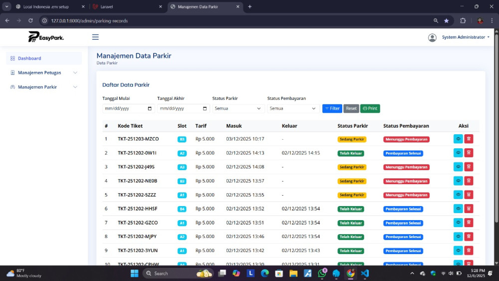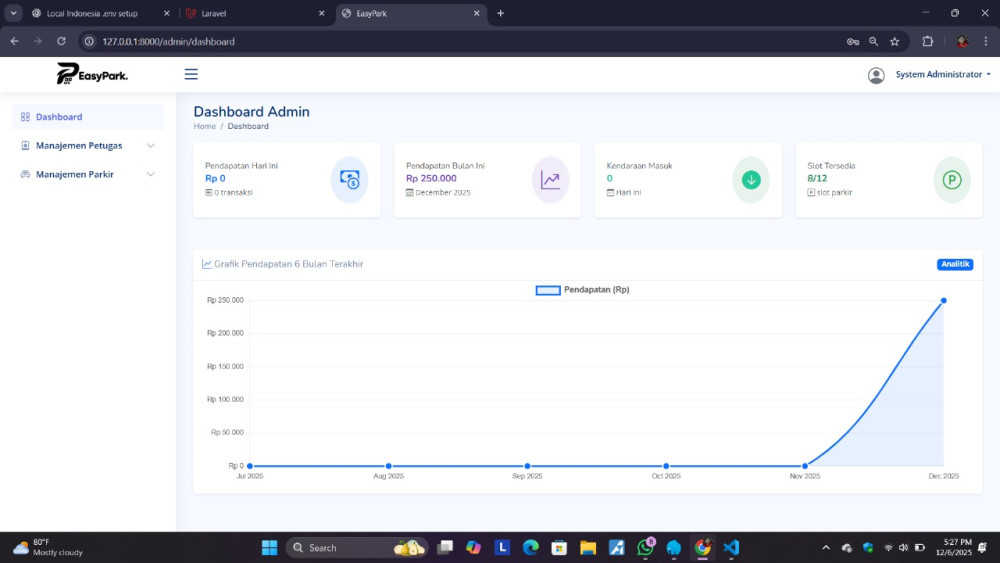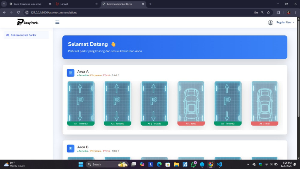 Untuk tampilan monitoring, EasyPark menyediakan dashboard berbasis Laravel Web yang memungkinkan petugas melihat kondisi area parkir secara real-time, termasuk tampilan kamera dan jumlah slot yang tersedia. Integrasi antara Computer Vision, IoT, dan sistem web menjadikan EasyPark sebagai solusi modern untuk pengelolaan parkir yang lebih efektif dan terorganisir.