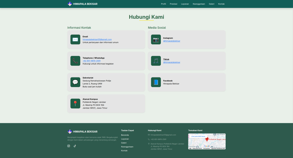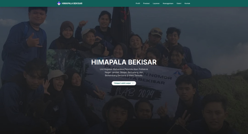 Website HIMAPALA BEKISAR adalah pusat informasi resmi untuk Unit Kegiatan Mahasiswa Pecinta Alam Politeknik Negeri Jember. Website ini berfungsi sebagai "wadah" yang menampilkan profil organisasi, sejarah berdiri, visi-misi, serta struktur kepengurusan. Selain itu, pengunjung bisa melihat dokumentasi kegiatan petualangan (seperti pendakian, susur sungai, dan konservasi), prestasi yang diraih, hingga informasi pendaftaran keanggotaan baru.