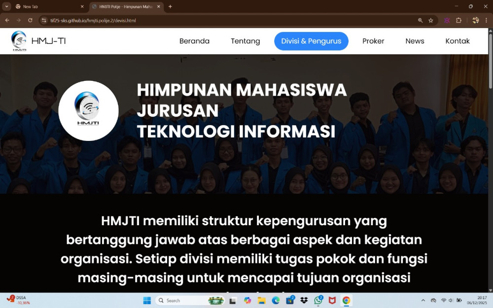 menyajikan informasi lengkap dan terstruktur mengenai HMJTI (Himpunan Mahasiswa Jurusan Teknologi Informasi). Website ini berfungsi sebagai media publikasi resmi untuk memperkenalkan struktur organisasi, program kerja, dan Berita terbaru
