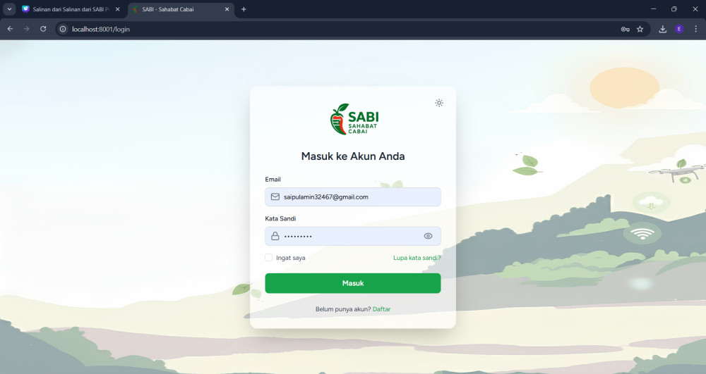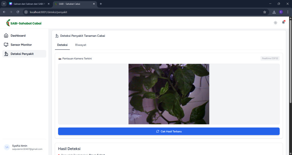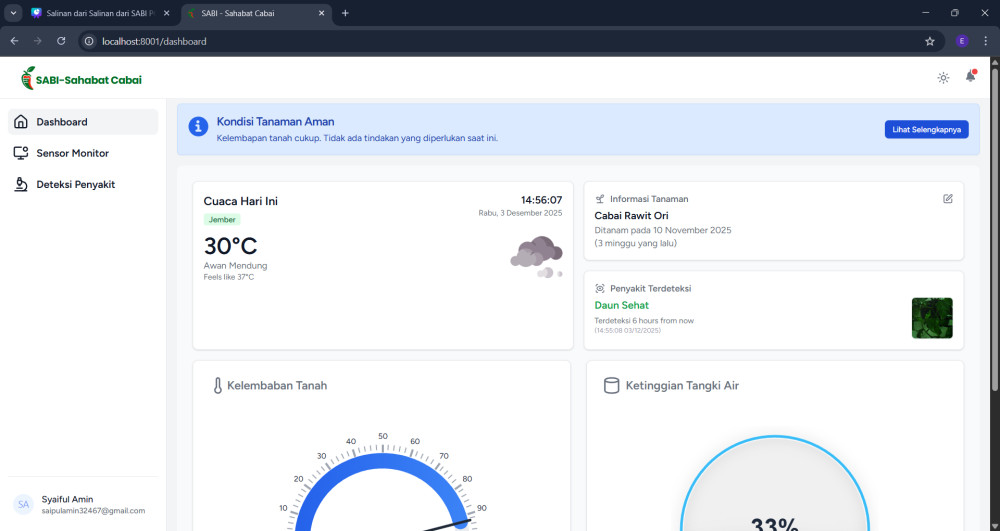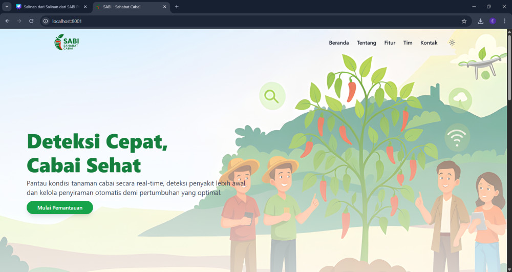 Sistem SABI, yaitu sistem Smart Farming yang terintegrasi Berbasis IoT dan Sistem Cerdas. Sistem ini memonitor kelembapan tanah menggunakan sensor soil moisture, mendeteksi penyakit daun cabai melalui kamera ESP32-CAM dan diolah oleh pengolahan citra vision lalu diklasifikasi oleh model SVM, serta menampilkan seluruh data pada dashboard web secara realtime untuk memudahkan petani.