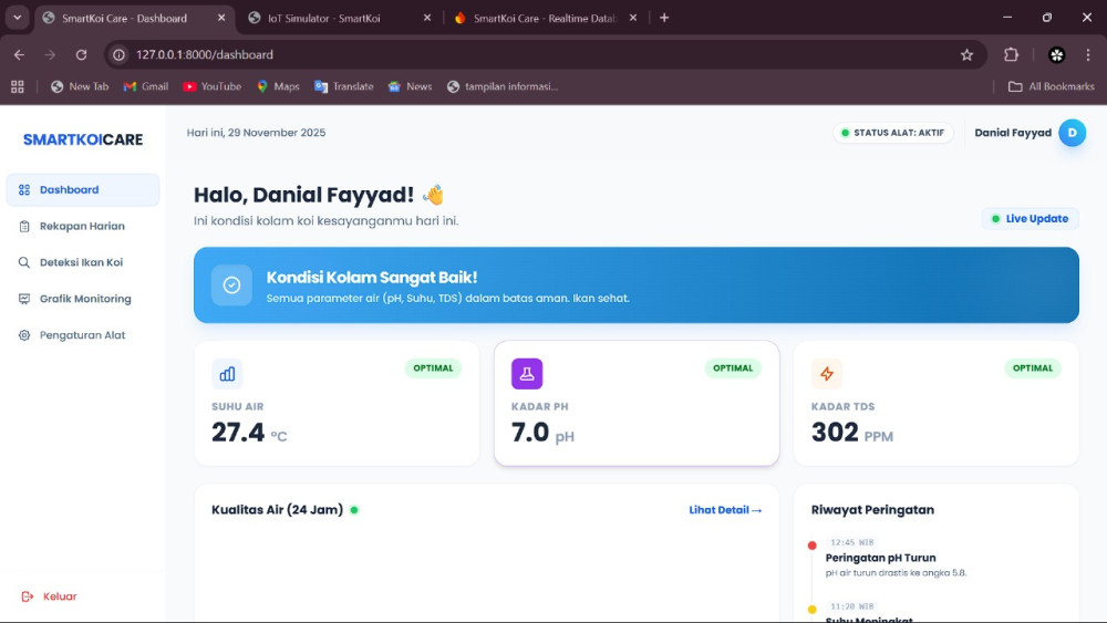 Sistem berintegrasi dengan IoT (Internet of Things) yang mampu membaca kadar pH, suhu, dan TDS (Total Dissolved Solids), sehingga pengguna dapat memantau kondisi kolam secara real-time.