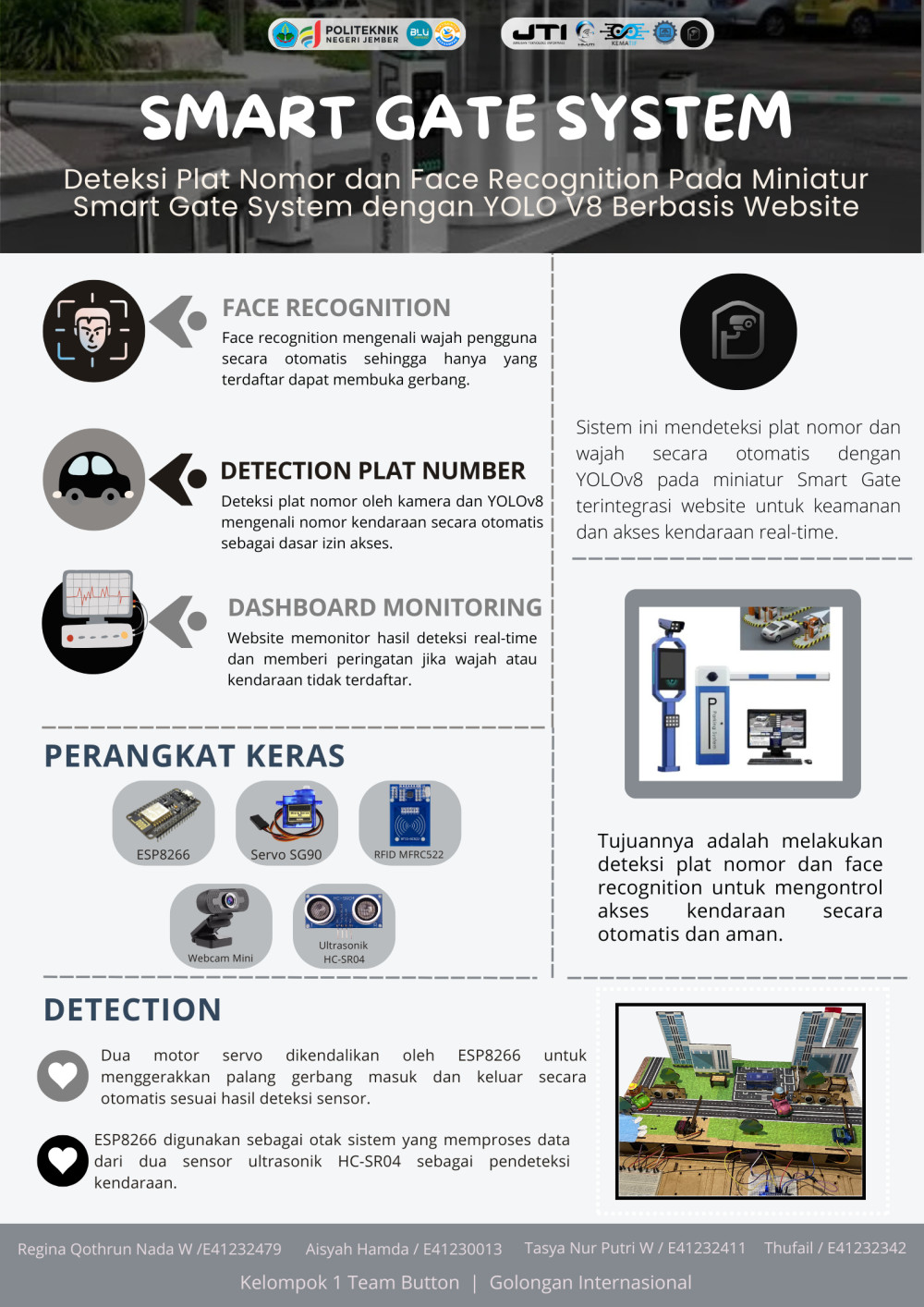 Smart Gate System adalah gerbang otomatis berbasis embedded system untuk mendeteksi kendaraan, membaca plat dengan OCR, dan melakukan pengenalan wajah sehingga gerbang terbuka otomatis jika data sesuai database. Sistem ini memakai YOLOv8 untuk deteksi wajah dan plat, EasyOCR dengan cropping, peningkatan contrast, Otsu, dan bounding box, serta ESP8266, sensor ultrasonik, servo, dan kamera sebagai sistem tertanam. Website menampilkan hasil deteksi real-time, dan face recognition menggunakan Haar Cascade, YOLOv8, serta FaceNet–Keras untuk ekstraksi fitur wajah.
