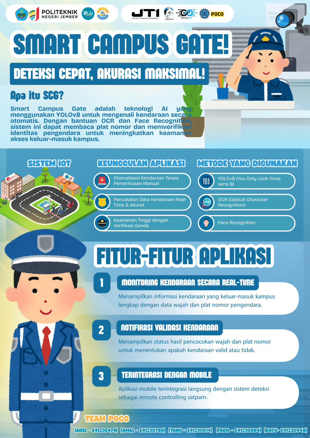 Smart Campus Gate merupakan inovasi keamanan kampus berbasis AI yang menggabungkan YOLOv8, OCR, dan Face Recognition untuk melakukan deteksi dan verifikasi kendaraan secara otomatis. Dengan monitoring real-time dan keamanan berlapis, sistem ini menghadirkan kontrol akses yang cepat, aman, dan efisien.