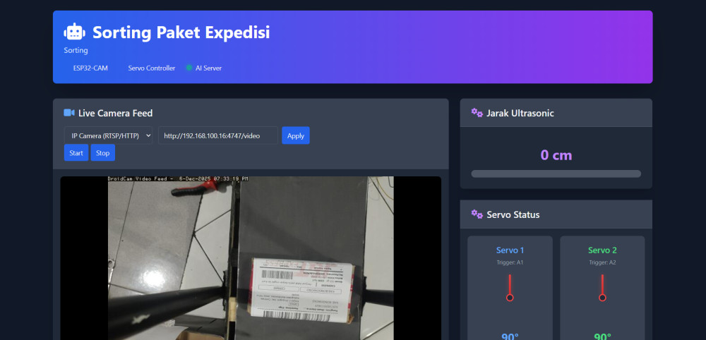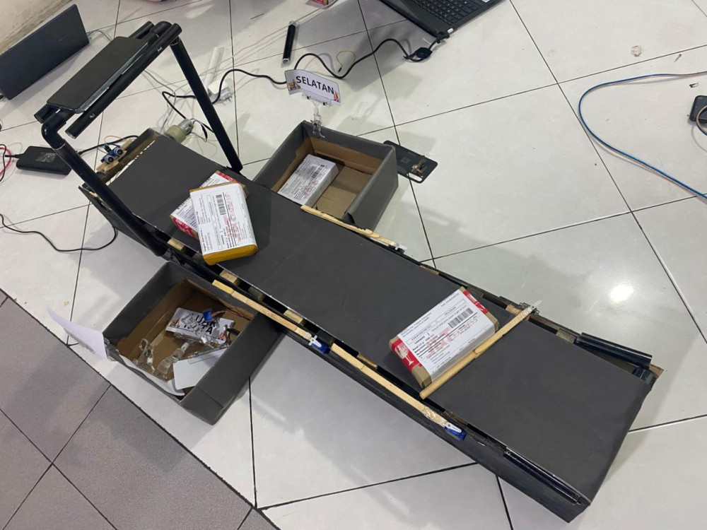 Sistem penyortiran otomatis menggunakan Conveyor Belt dan teknologi OCR untuk membaca label alamat pada paket saat bergerak. OCR mengenali teks secara langsung, lalu paket dialihkan ke jalur yang sesuai berdasarkan tujuan.