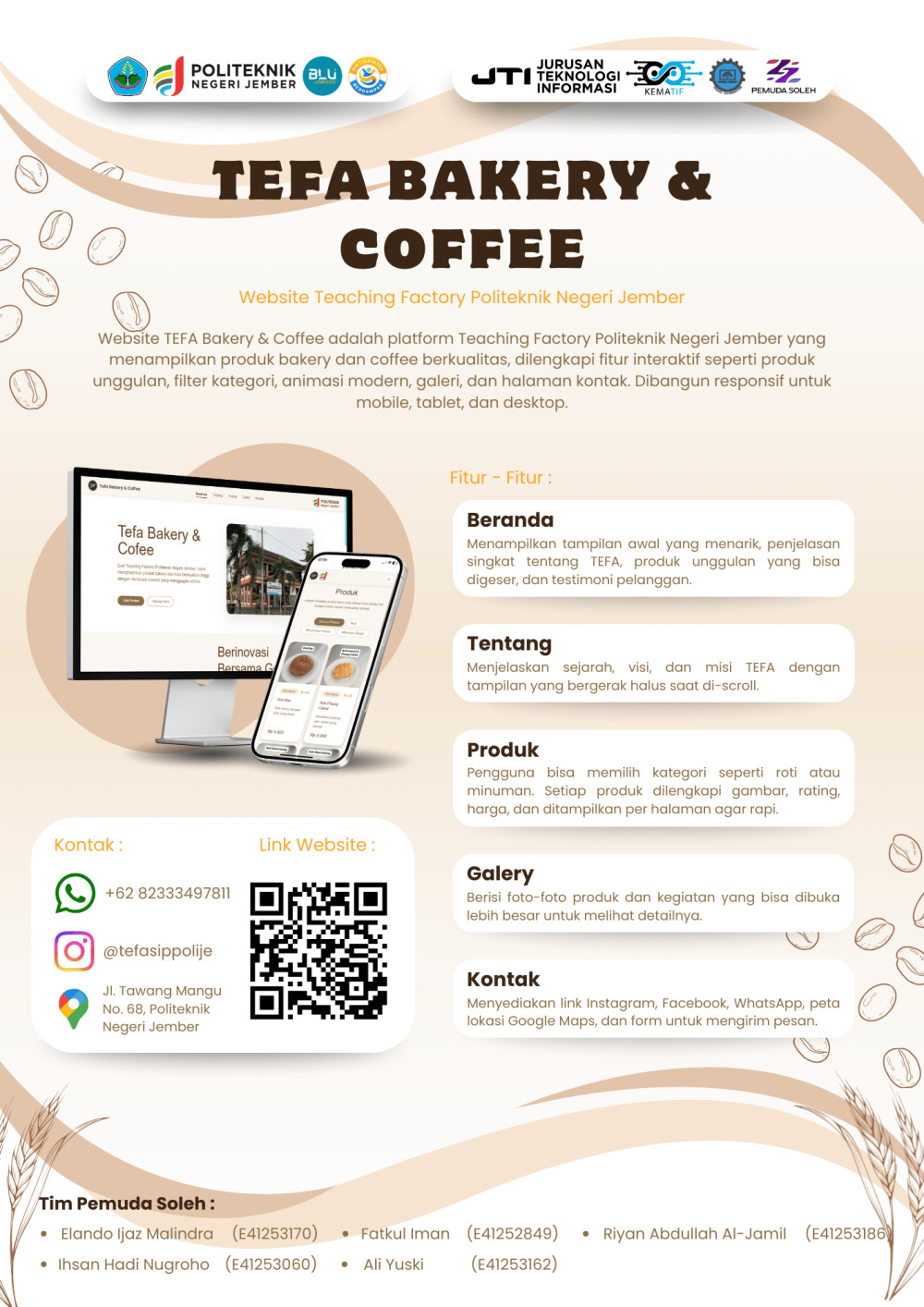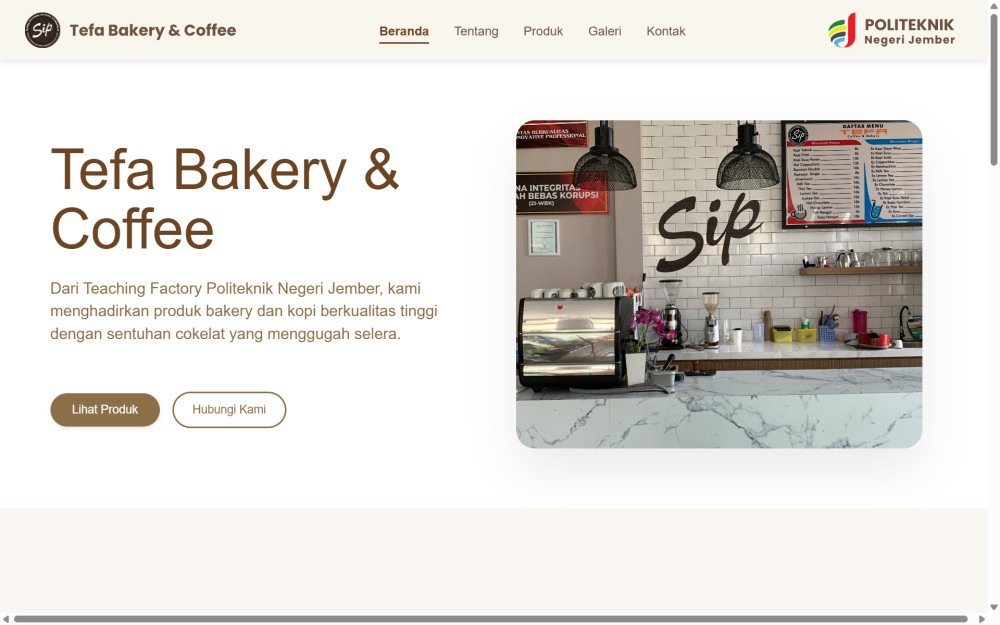 Website TEFA Bakery & Coffee merupakan platform resmi Teaching Factory Politeknik Negeri Jember (Polije) yang berfungsi untuk menampilkan serta mempromosikan berbagai produk bakery dan kopi. Situs ini dirancang untuk menunjukkan profesionalisme, inovasi, serta jiwa kewirausahaan yang dikembangkan oleh para mahasiswa. Pada halaman utama, pengunjung disambut dengan identitas brand yang kuat, slogan “Berinovasi Bersama Generasi”, serta tombol ajakan (CTA) untuk melihat produk atau menghubungi tim TEFA. Struktur website disusun dengan rapi dan mudah dipahami, sehingga pengguna dapat menjelajahi halaman Beranda, Tentang, Produk, Galeri, hingga Kontak dengan sangat mudah melalui menu navigasi utama. Setiap halaman juga dibuat responsif agar tetap nyaman diakses baik melalui perangkat komputer maupun ponsel. Secara keseluruhan, website ini tidak hanya menampilkan produk, tetapi juga menggambarkan identitas TEFA sebagai bagian dari kegiatan pembelajaran berbasis industri. Komitmen terhadap kualitas produk, pelayanan, dan kepuasan pelanggan ditunjukkan melalui halaman Tentang, tampilan statistik seperti jumlah tahun pengalaman dan jumlah pelanggan, galeri foto, informasi kontak, serta testimoni dari para pelanggan.