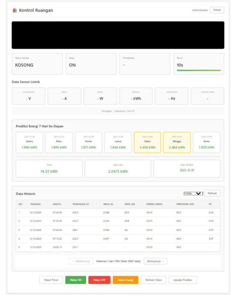 Key Features & Tech Stack: Specific-Location Detection: Menggunakan Webcam + HSV Feature Extraction + SVM Classifier. Sistem dilatih dengan dataset spesifik kamar saya, sehingga mampu membedakan antara "Orang (walau sedang tidur)" dan "Gorden/Kursi". Energy Forecasting: Mengintegrasikan sensor PZEM-004T dan algoritma Linear Regression untuk memprediksi tren konsumsi daya 7 hari ke depan. Smart Control: Terintegrasi dengan ESP32 & MQTT (HiveMQ) untuk kontrol real-time via jaringan internet.
