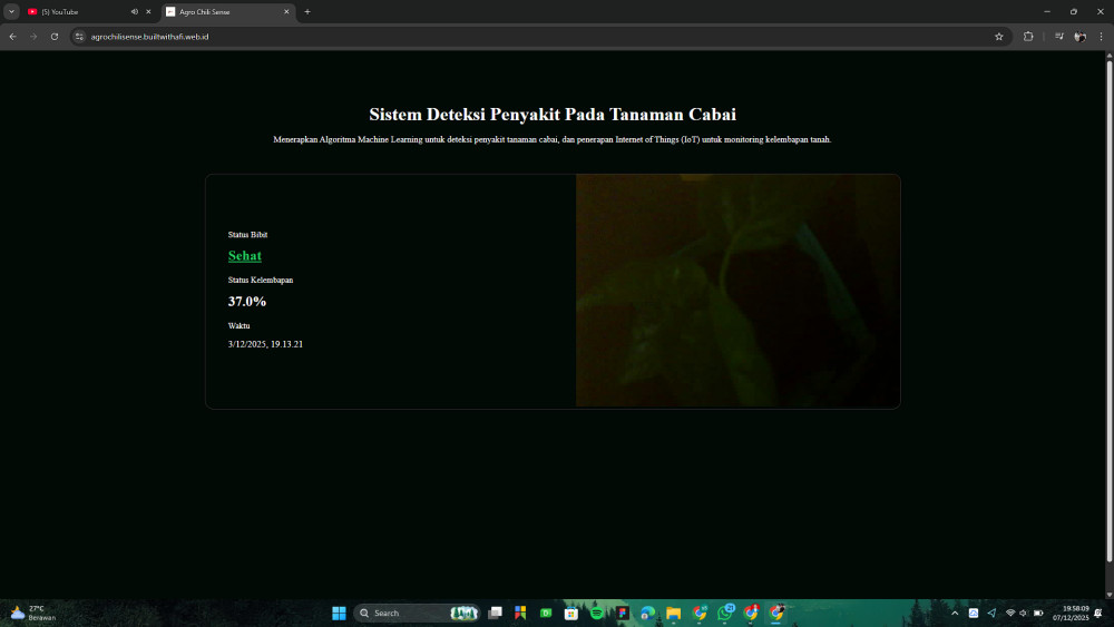 AGRO CHILLI SENSE adalah sebuah sistem yang dirancang untuk petani cabai agar bisa melakukan otomatisasi penyiraman, mendeteksi kelembaban tanah, mendeteksi penyakit bibit cabai dari daun nya.