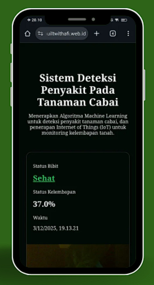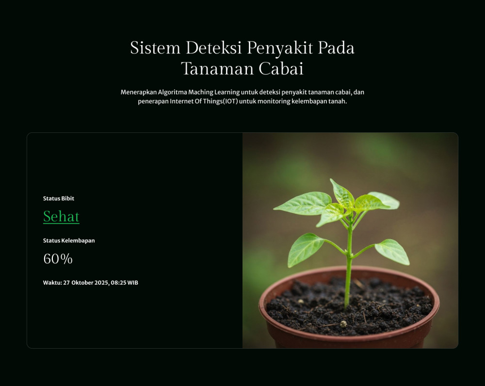 Sistem ini dirancang dengan Internet of Things IoT sebagai penyiraman otomatis ketika kelembaban tanah kurang dari ambang batas yang telah ditetapkan(60%), Menyediakan website untuk monitoring kelembapan dan melihat hasil klasifikasi bibit petani, Klasifikasi dilakukan dengan melakukan pemotretan atau pengambilan citra daun bibit cabai secara otomatis yang kemudian diproses dan diklasifikasi menggunakan algoritma machine learning random forest.