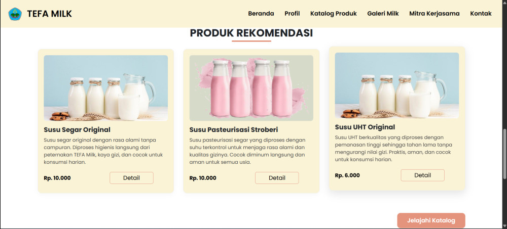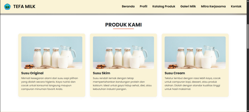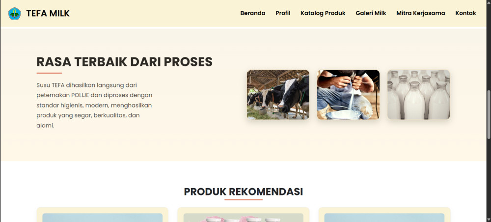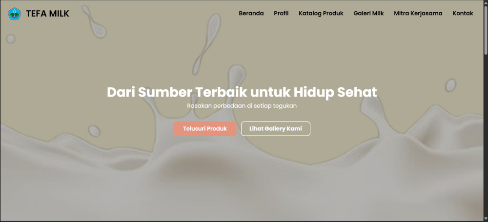 TEFA Milk adalah platform web yang menyediakan informasi lengkap tentang produk olahan susu segar dari Teaching Factory. Website ini membantu pelanggan mengenal produk, proses produksi, kualitas, dan memudahkan pemesanan dengan antarmuka yang modern dan responsif.