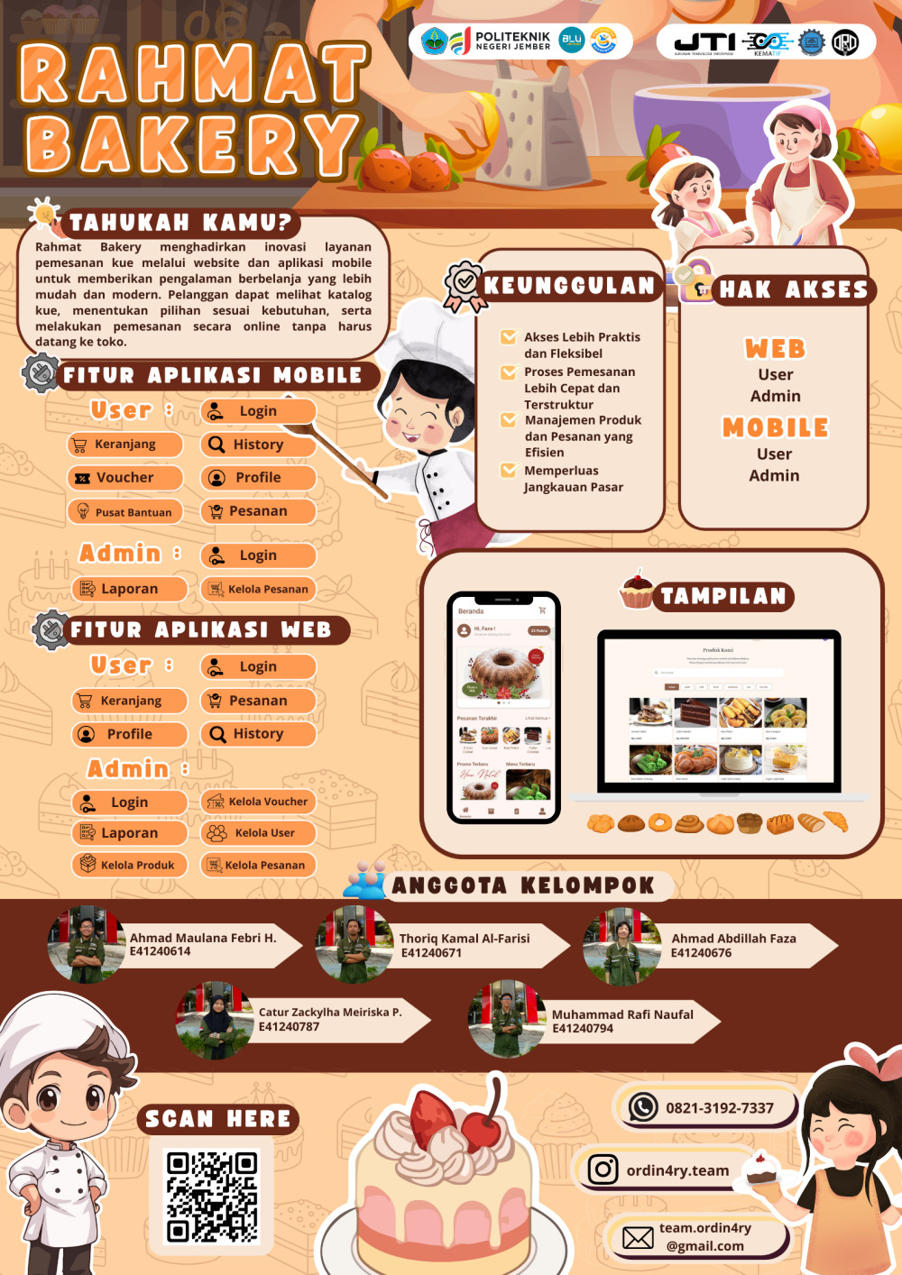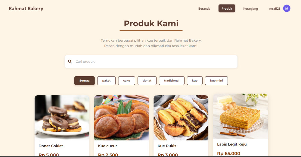 RAHMAT BAKERY merupakan layanan pemesanan roti dan kue yang kini hadir dalam bentuk Aplikasi Mobile dan Website untuk memudahkan pelanggan melakukan pemesanan secara daring. Melalui platform ini, pelanggan dapat melihat katalog produk lengkap, mulai dari berbagai pilihan roti, kue, hingga varian khusus dengan informasi harga dan detail produk yang jelas. Pemesanan dapat dilakukan dengan cepat tanpa harus datang ke toko, cukup memilih produk, mengisi data, dan menyelesaikan pembayaran langsung melalui sistem.