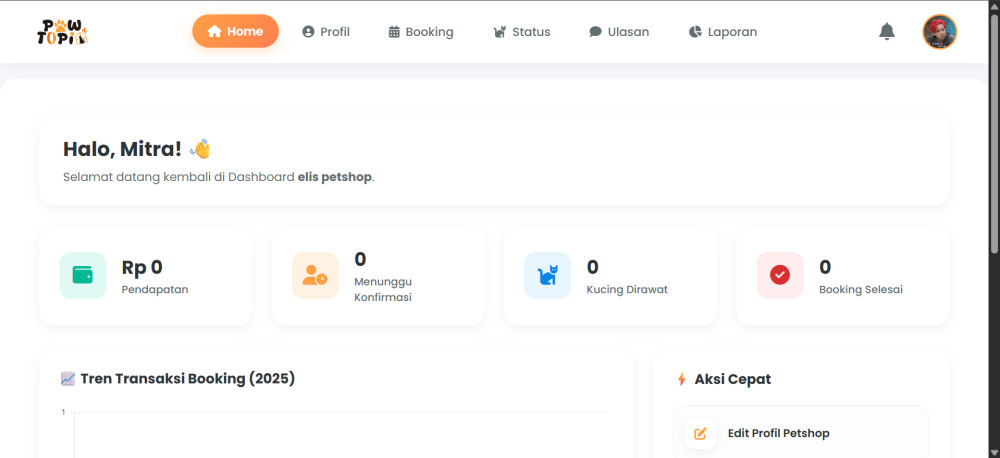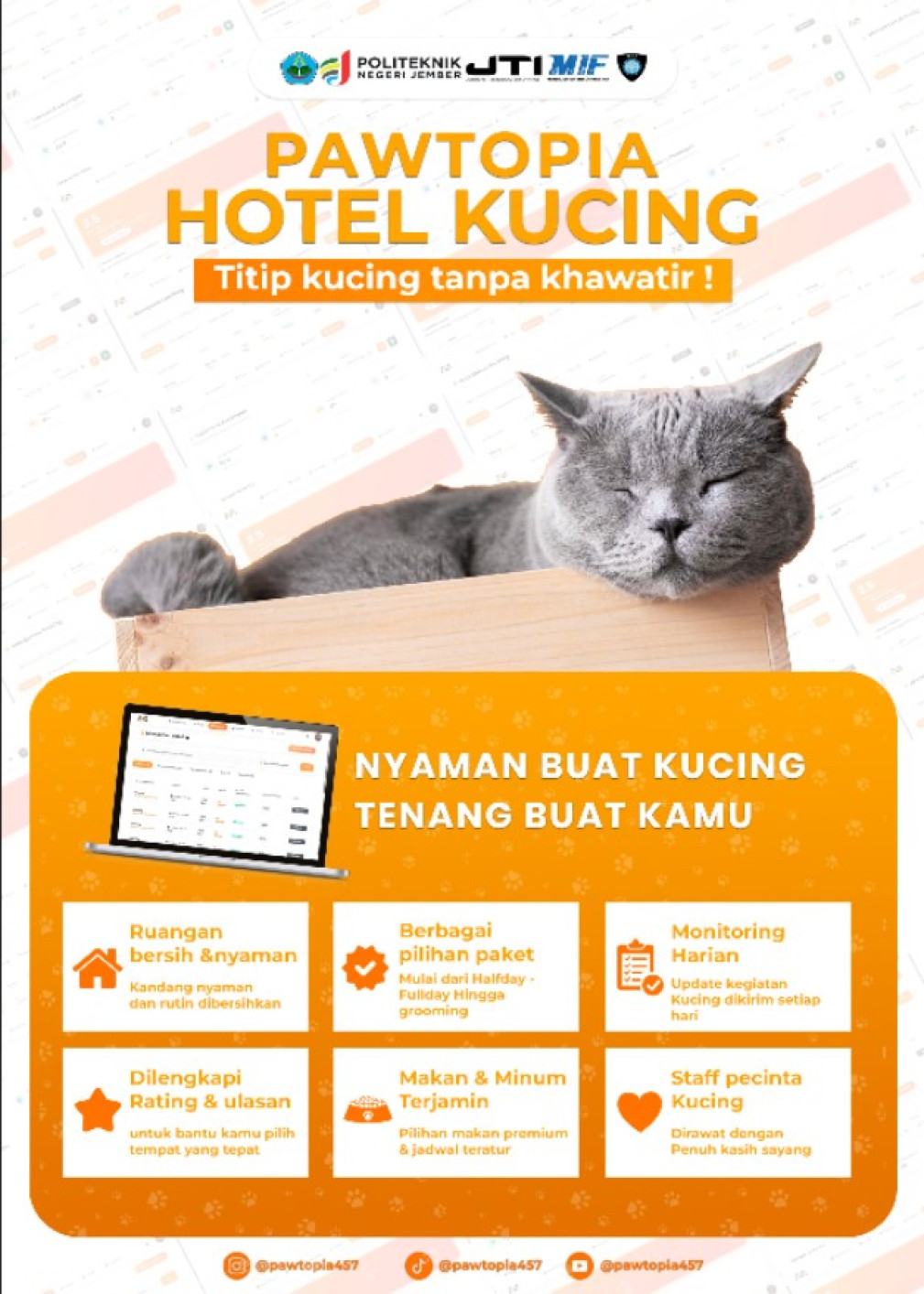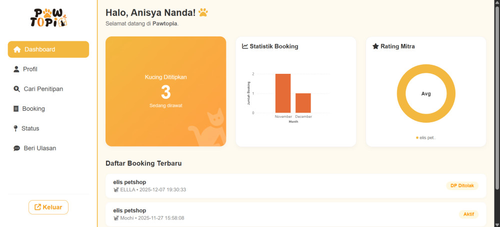 Pawtopia adalah platform yang menghubungkan customer dan mitra penitipan kucing dalam satu sistem digital dengan nama Pawtopia. Platform ini memudahkan proses pencarian, pemesanan, dan pemantauan penitipan, sekaligus membantu mitra mengelola booking, status, ulasan, dan pendapatan dengan lebih efisien.