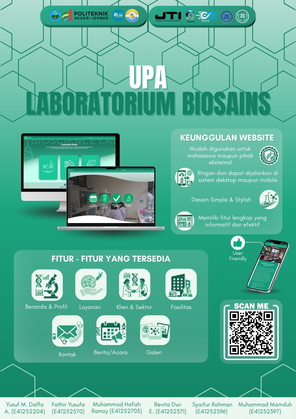 Website UPA Laboratorium Biosains Politeknik Negeri Jember merupakan platform digital yang dirancang untuk memperkenalkan profil, layanan, fasilitas, dan aktivitas Laboratorium Biosains secara informatif, modern, dan mudah diakses. Website ini dibuat sebagai pusat informasi resmi yang membantu mahasiswa, peneliti, industri, dan masyarakat umum dalam mengenal berbagai layanan biosains yang tersedia.