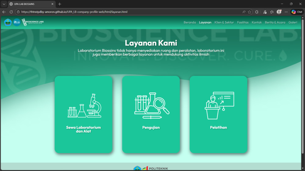 Dengan desain visual yang rapi, navigasi intuitif, serta konten yang terstruktur, website ini menjadi sarana komunikasi yang efektif untuk menunjukkan profesionalitas dan kapabilitas laboratorium dalam bidang biosains, pengujian, riset, dan pelatihan.