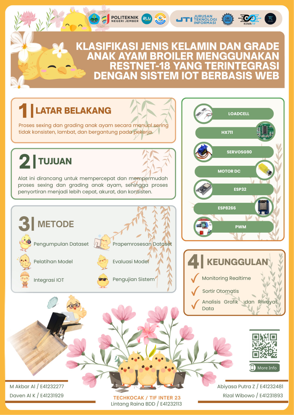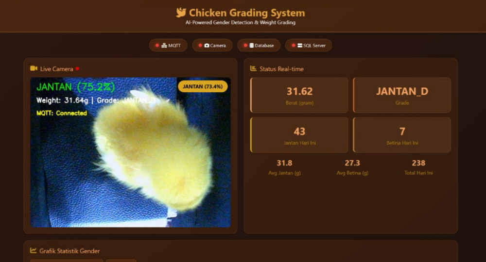 Alat sortir anak ayam otomatis yang memadukan kamera, kecerdasan buatan, dan sensor berat untuk membuat proses pengelompokan ayam secara konsisten, dan rapi. Sistem ini bekerja dengan cara menangkap gambar, menentukan jenis kelamin & grade, menimbang berat, lalu mengarahkan ayam ke jalur yang tepat menggunakan mekanisme servo otomatis.