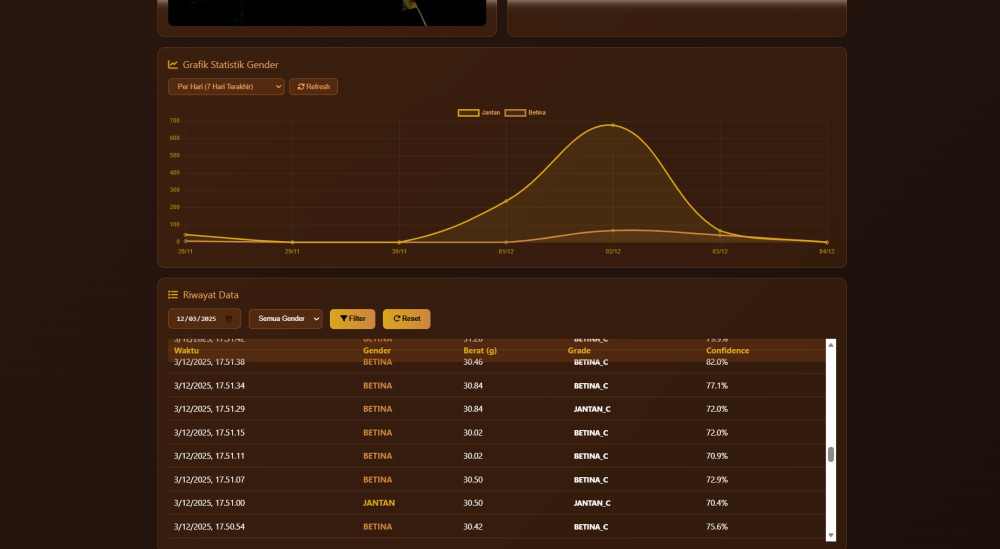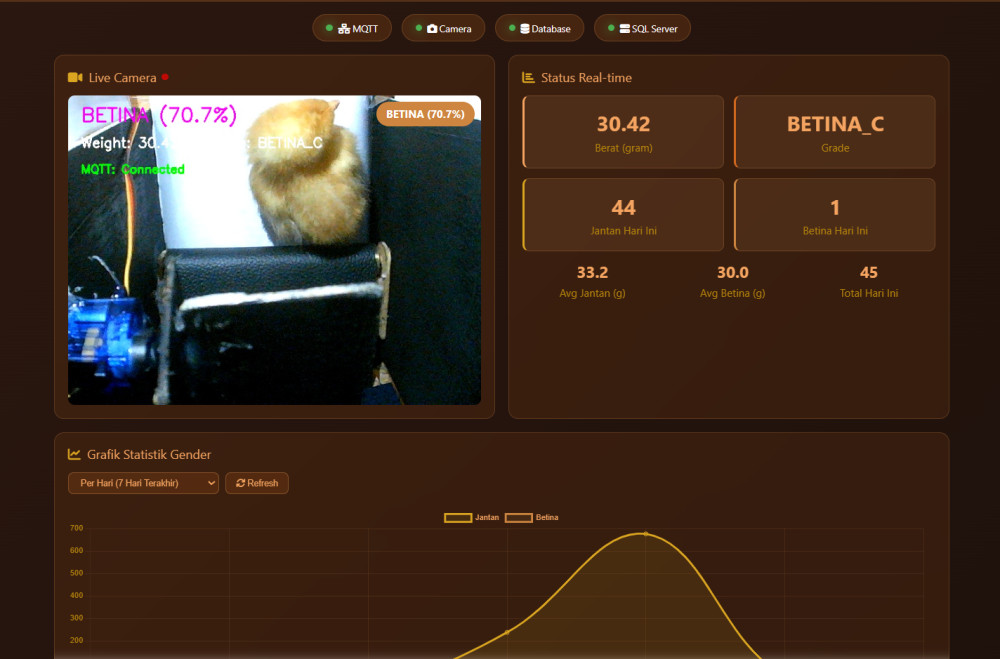 • Dashboard Web 💻📊 – Menampilkan gambar, berat, status perangkat, dan hasil klasifikasi.