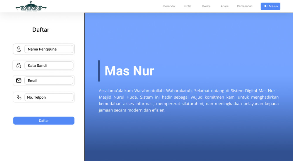 Kami dengan bangga mempersembahkan MasNur App, sebuah sistem informasi digital terpadu berbasis Mobile & Website yang dikembangkan khusus untuk memudahkan seluruh aktivitas di Masjid Nurul Huda! MasNur App dirancang untuk memfasilitasi jamaah, pengurus masjid, dan masyarakat umum dalam mengakses layanan serta informasi masjid secara cepat, terstruktur, dan transparan.