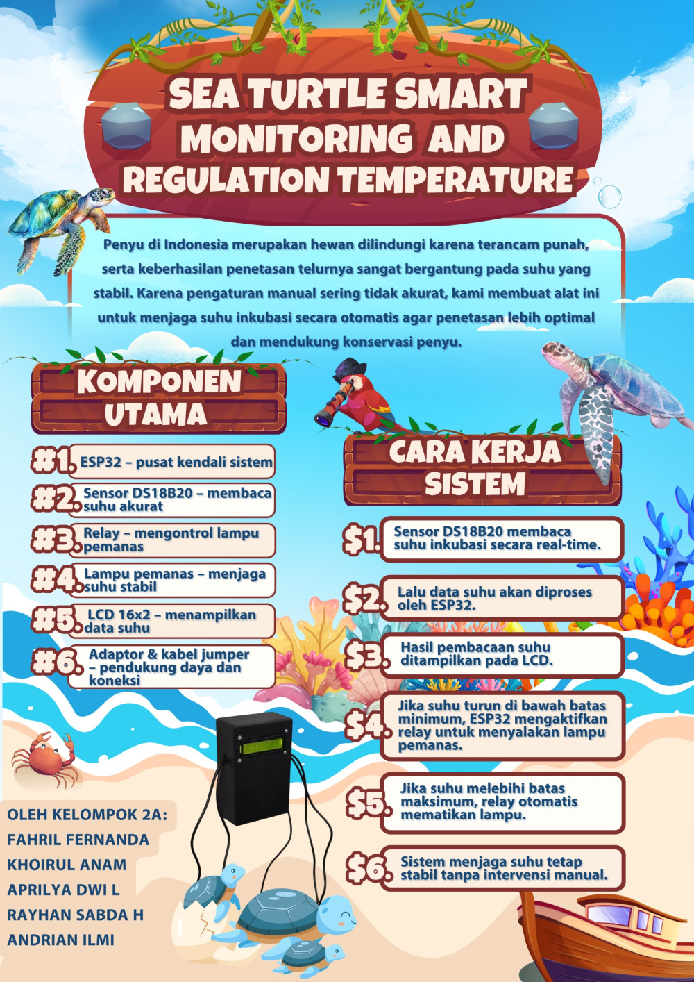 Proyek Sea Turtle Smart Monitoring and Regulation Temperature merupakan sistem berbasis Internet of Things (IoT) yang dirancang untuk memantau suhu inkubasi telur penyu secara real-time sekaligus melakukan pengaturan suhu secara otomatis. Sistem ini menggunakan ESP32 sebagai pengendali utama, sensor DS18B20 sebagai pembaca suhu, LCD sebagai penampil data suhu, serta relay dan lampu sebagai alat pengatur suhu. Seluruh komponen tersebut bekerja sama untuk menjaga suhu inkubasi tetap stabil sesuai dengan batas yang ditentukan.