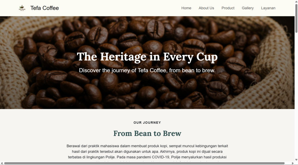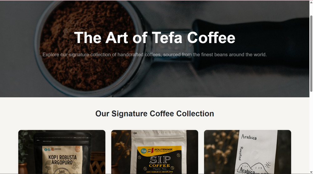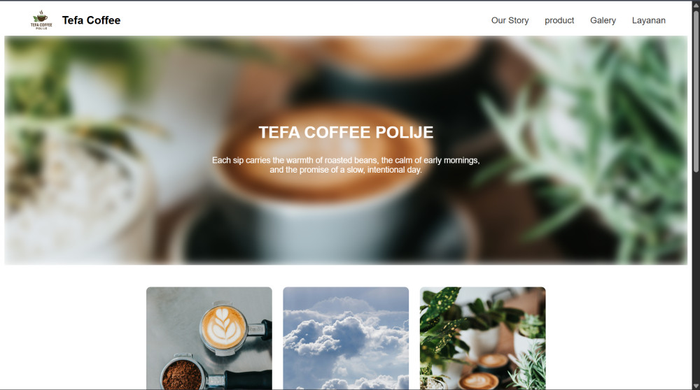 Website Tefa Coffee Polije dibuat sebagai media informasi dan branding untuk memperkenalkan produk kopi hasil Teaching Factory Politeknik Negeri Jember. Website ini dirancang dengan tampilan modern, sederhana, dan mudah digunakan, sehingga pengunjung dapat memahami tujuan, identitas, dan kualitas produk kopi yang ditawarkan.