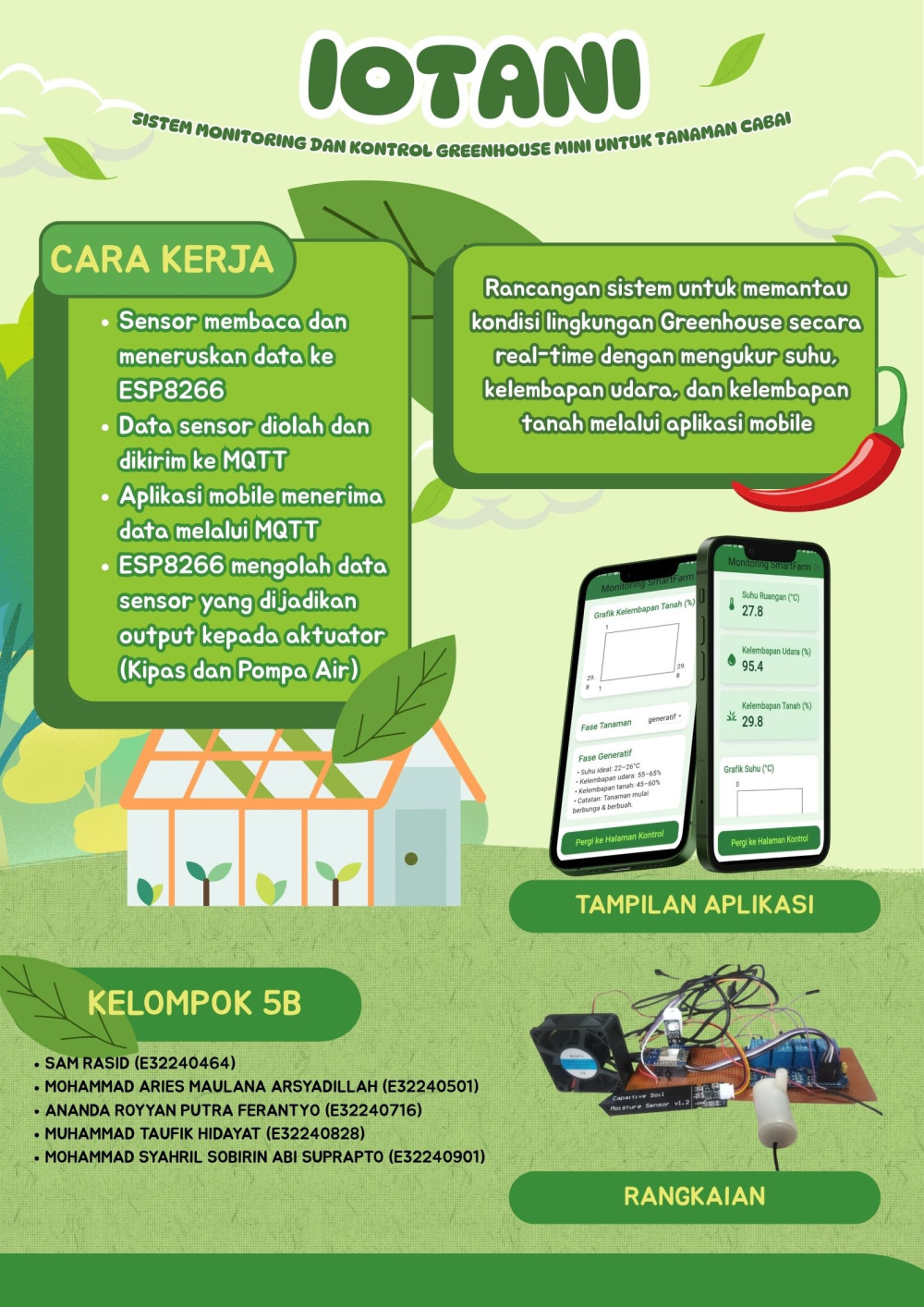 IoTani sistem monitoring dan kontrol lingkungan pada Greenhouse mini untuk tanaman cabai menggunakan sensor DHT-22 dan Capacitive Soil Moisture. Sistem ini dirancang untuk memantau kondisi lingkungan Greenhouse secara real-time dengan mengukur suhu, kelembapan udara, dan kelembapan tanah melalui aplikasi mobile. Mikrokontroler ESP8266 Wemos D1 Mini dipilih sebagai pusat pengolahan data karena mendukung konektivitas WiFi, sehingga data sensor dapat dikirimkan secara nirkabel ke server untuk dipantau dan diproses.