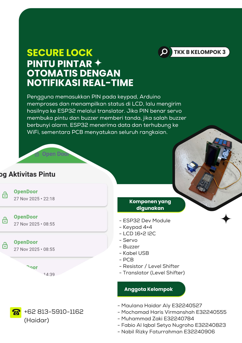 SECURE LOCK adalah sistem keamanan pintu otomatis yang menyediakan akses berbasis PIN melalui Keypad 4x4, diproses oleh Arduino yang menampilkan status pada LCD 16x2 I2C, dan mengaktifkan Servo untuk membuka kunci jika PIN benar, atau membunyikan Buzzer sebagai alarm jika PIN salah. Komponen utamanya, ESP32 Dev Module, berfungsi sebagai inti cerdas yang, setelah menerima data, terhubung ke WiFi untuk mengirimkan notifikasi aktivitas pintu secara real-time kepada pengguna, memastikan keamanan ganda dan pemantauan jarak jauh yang efektif, sementara seluruh rangkaian disatukan secara profesional pada PCB.