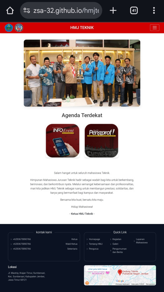 Website HMJ Teknik adalah situs resmi himpunan mahasiswa jurusan Teknik yang berisi informasi tentang organisasi, struktur pengurus, kegiatan, berita, galeri, serta layanan untuk mahasiswa. Situs ini dibuat sebagai pusat informasi dan komunikasi untuk mendukung aktivitas, pengembangan, dan koordinasi mahasiswa Teknik.