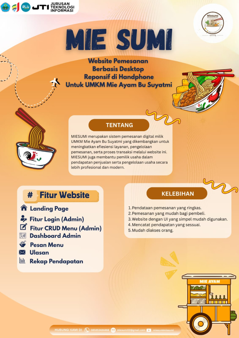 Dengan adanya Miesumi, UMKM Mie Ayam Bu Suyatmi semakin siap menghadapi era digital, meningkatkan pelayanan, memperluas jangkauan pasar, dan memberikan pengalaman pemesanan yang lebih terorganisir. Website ini menjadi bukti nyata bahwa kuliner tradisional dapat beradaptasi dengan teknologi modern tanpa kehilangan kehangatan dan cita rasa khasnya.