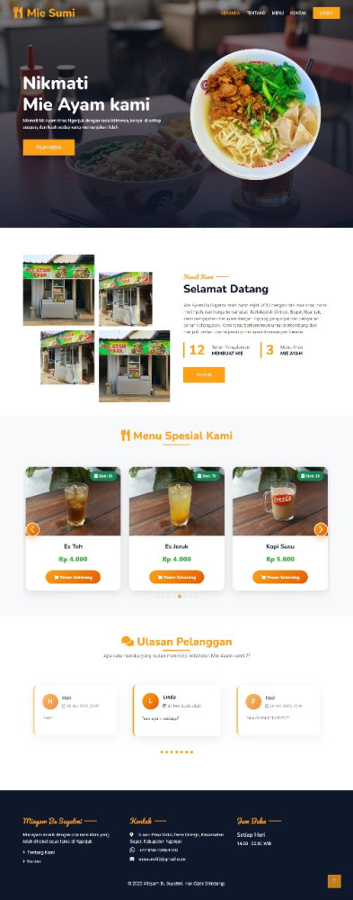 Miesumi adalah website resmi UMKM Mie Ayam Bu Suyatmi yang hadir sebagai solusi modern untuk mempermudah pelanggan dalam menikmati kelezatan mie ayam khas Bu Suyatmi. Dengan mengusung konsep digitalisasi UMKM, Miesumi tidak hanya menjadi sarana pemesanan online, tetapi juga wadah untuk memperkenalkan cita rasa kuliner lokal kepada masyarakat yang lebih luas.