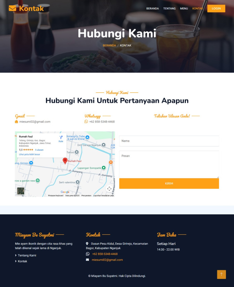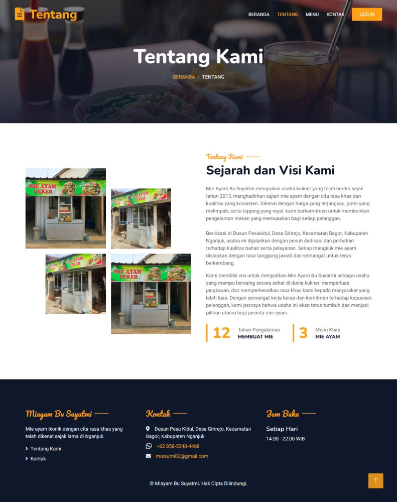 Selain itu, Miesumi juga menyediakan informasi mengenai profil UMKM, kisah perjalanan Bu Suyatmi dalam membangun usaha mie ayam, serta kontak dan lokasi yang terintegrasi dengan peta digital. Hal ini memudahkan pelanggan baru untuk menemukan warung secara cepat dan akurat.