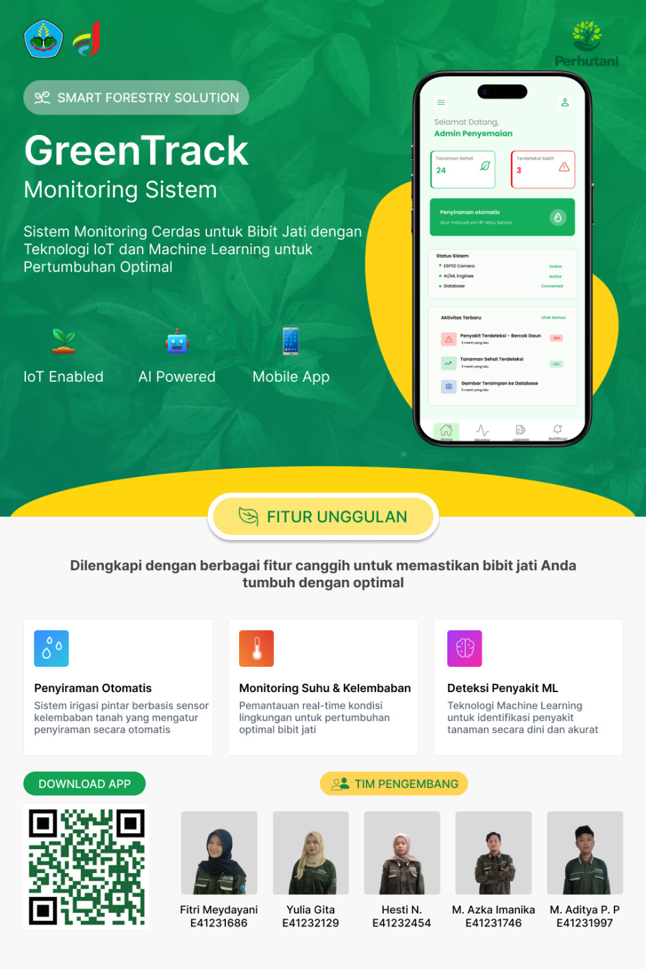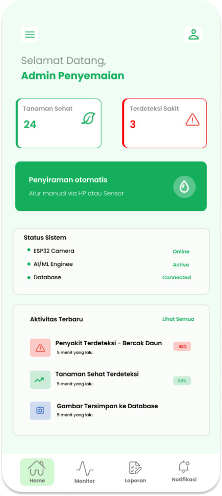 Melalui GreenTrack IoT, pengguna dapat memantau tingkat kelembaban tanah secara langsung, melihat dokumentasi visual pertumbuhan tanaman yang diambil secara terjadwal, serta mengontrol sistem penyiraman baik secara otomatis maupun manual melalui antarmuka aplikasi yang intuitif. Aplikasi ini juga dilengkapi dengan teknologi Machine Learning yang mampu mengklasifikasikan kondisi tanaman berdasarkan gambar yang diambil, sehingga pengguna dapat mengetahui kesehatan tanaman mereka dengan lebih akurat.