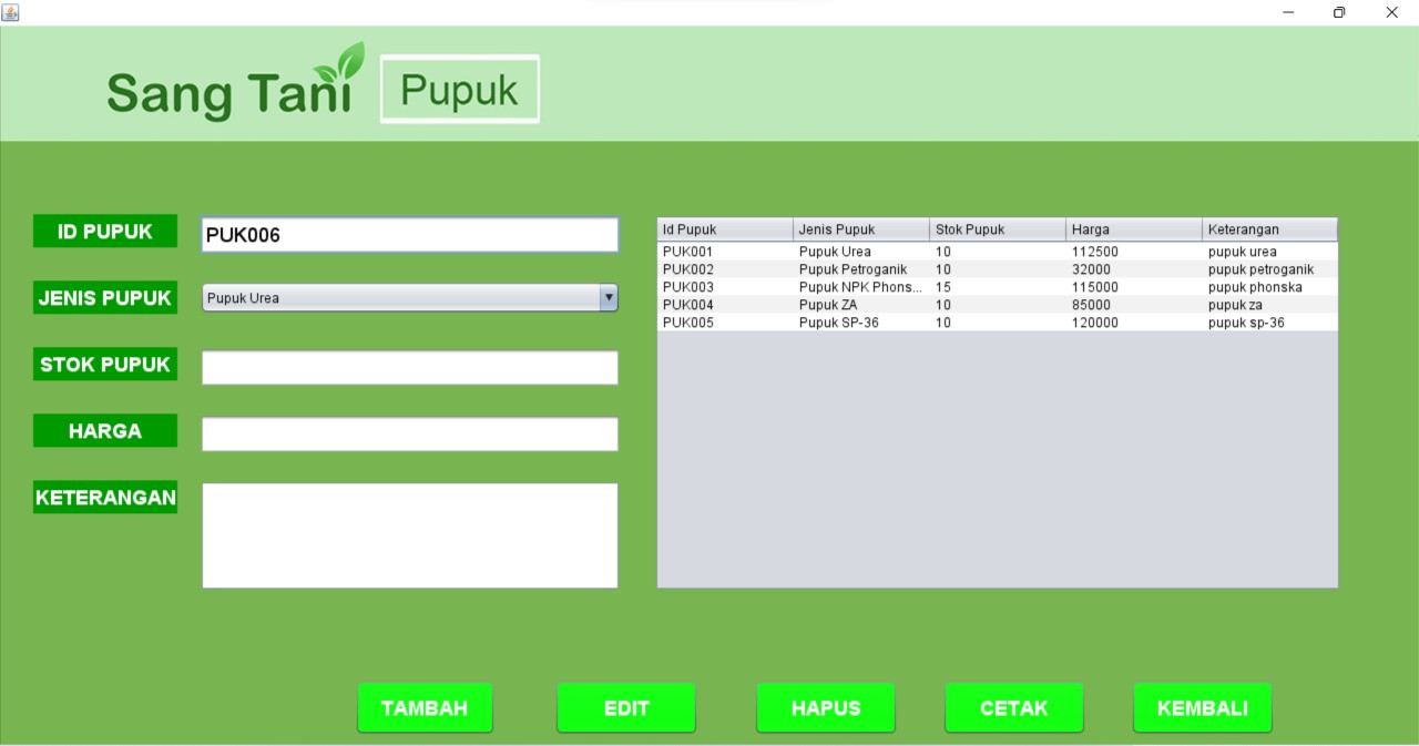 Aplikasi Sang Tani dibuat untuk memudahkan Admin agar lebih mudah dalam hal mendaftarkan kartu tani dan mendata jenis-jenis pupuk sekaligus mendata transaksi penjualan pupuk.