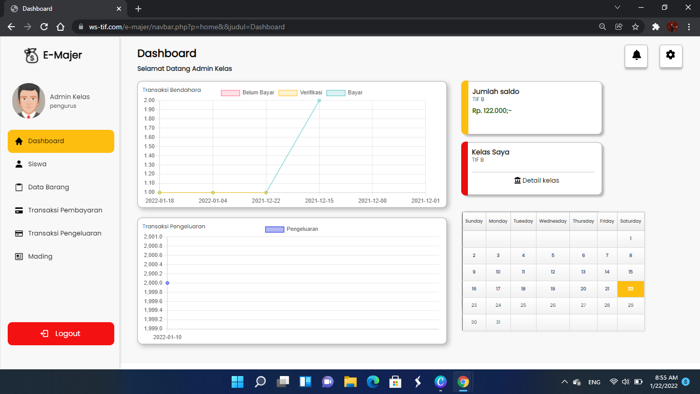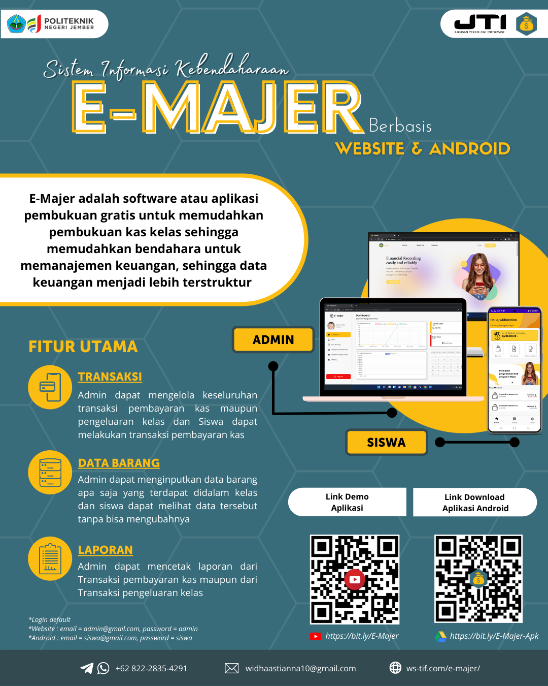E-Majer adalah software atau aplikasi pembukuan gratis untuk memudahkan pembukuan kas kelas sehingga memudahkan bendahara untuk memanajemen keuangan, sehingga data keuangan menjadi lebih terstruktur. E-Majer hadir dengan berbasis Website dan Mobile Android dengan hak akses Admin atau pengurus kelas pada Website dan Siswa untuk aplikasi Android.
