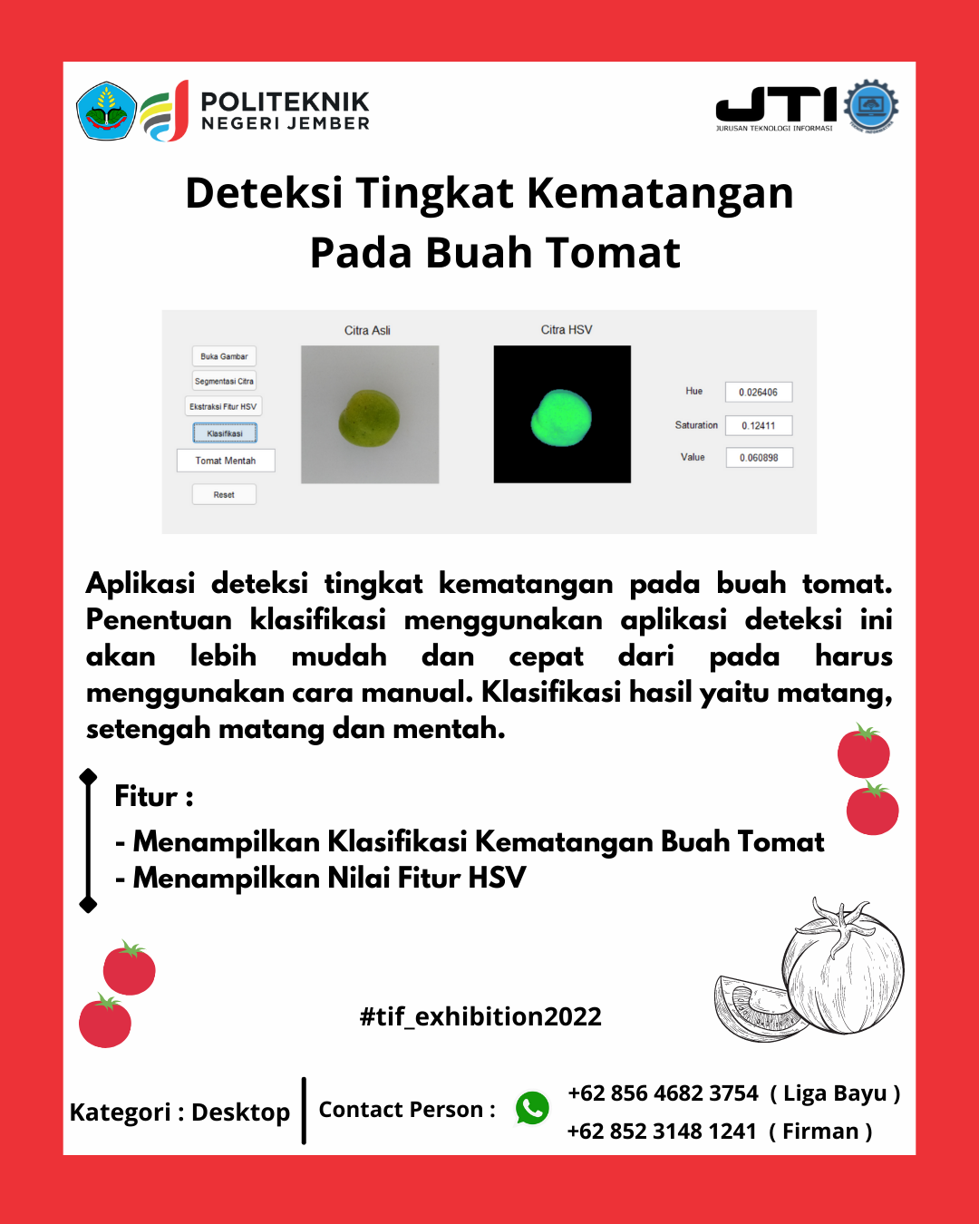 Aplikasi deteksi tingkat kematangan pada buah tomat. Penentuan klasifikasi menggunakan aplikasi deteksi ini akan lebih mudah dan cepat dari pada harus menggunakan cara manual. Klasifikasi hasil yaitu matang, setengah matang dan mentah.