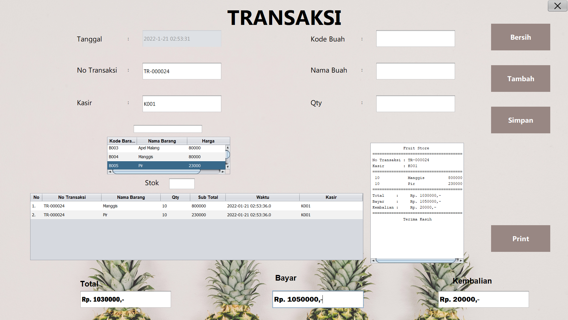 adalah sebuah Sistem Informasi Transaksi Toko Buah Berbasis Desktop yang berfungsi untuk mempermudah admin dan karyawan toko dalam proses transaksi serta pendataan barang. Dalam hal ini kami berinisiatif untuk menghasilkan suatu sistem yang dapat mengetahui informasi stok barang, serta sistem yang dapat memberikan informasi yang akurat, cepat, dan mudah digunakan dalam suatu aktifitas toko buah.