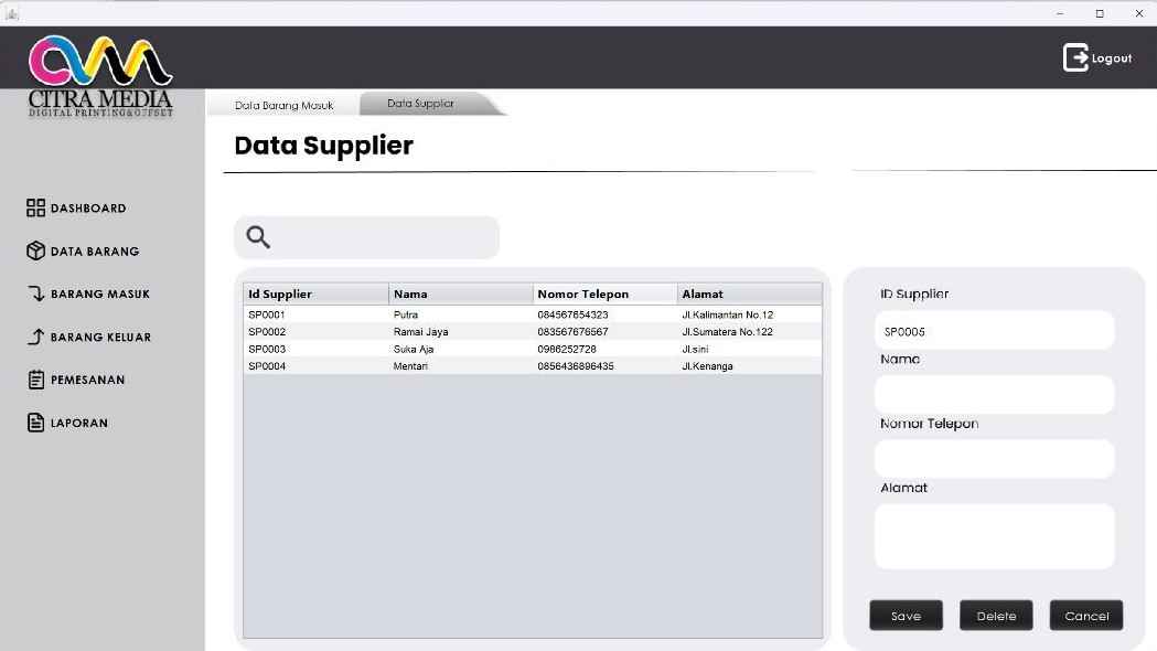 Merupakan aplikasi pengatur stok barang untuk perusahaan cetak citra media untuk mempermudah perusahaan tersebut untuk mengatur stok barangnya.yang didalamnya terdapat beberapa fitur yaitu "data barang","barang masuk","barang keluar","pemesanan",dan" laporan"