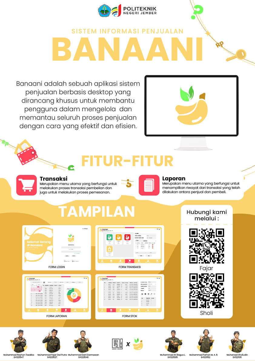 Banaani adalah aplikasi sistem penjualan berbasis desktop yang dikembangkan khusus untuk membantu pengguna dalam mengelola dan memantau proses dari penjualan dengan cara yang efektif dan efisien. Banaani memiliki fitur-fitur yang komprehensif, seperti :