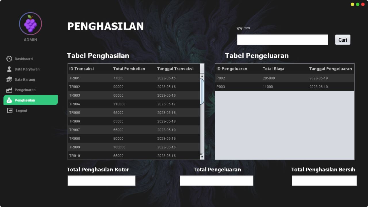 Sistem Informasi Transaksi Penjualan Buah dan Bibit Anggur Impor merupakan sebuah aplikasi yang mempermudah proses transaksi penjualan buah dan bibit anggur impor. Aplikasi ini memiliki beberapa fitur yang membantu dalam mengelola transaksi penjualan,menyimpan riwayat transaksi, mengelola stok barang, dan menghasilkan laporan penghasilan.